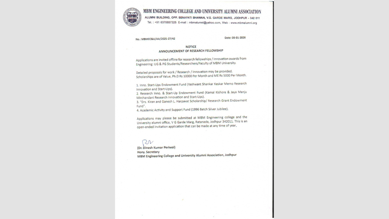 The Alumni Association strives to help needy and meritorious students of MBM Engineering college in their academic pursuits. Our Alumni generously contribute towards this cause.